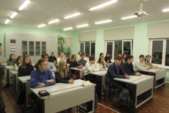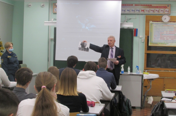 На одном из уроков в 9б классе выступил заместитель председателя Всеволожского местного отделения Ленинградского областного отделения ВДПО Валерий Николаевич Миклин. Он рассказал в каких условиях пришлось жить и работать пожарным в годы Великой Отечественной войны. О бойцах городских пожарных команд (ГПК) эвакуированных из других городов и районов Ленинградской области: Новгорода, Луги, Гатчины, Павловска, Сестрорецка.