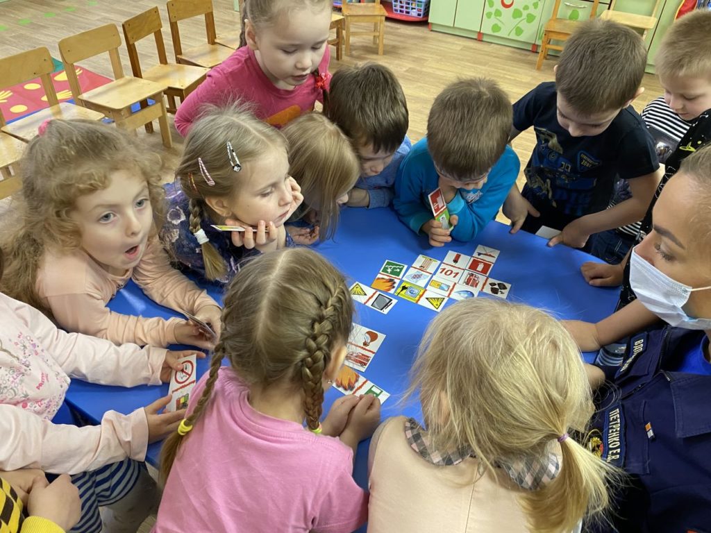 Чтобы немного разбавить серьезный лекционный материал и внести нотки развлекательных, но полезных механик, дети поиграли в пожарное домино – сначала просто соединяли совпадающие карточки, а потом стали еще и придумывать истории.