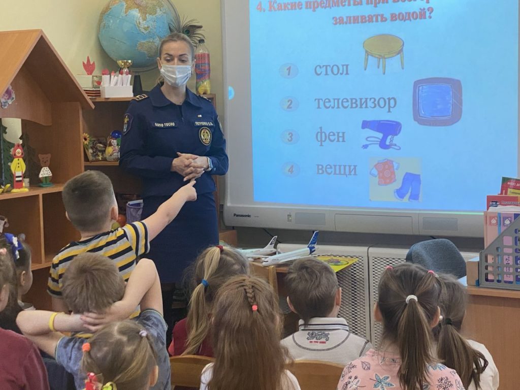 Урок начался с викторины «Знаешь ли ты правила пожарной безопасности?» — ведь дети уже не первый раз встречаются с гостьями и было очень важно проверить какой материал с прошлых занятий они усвоили хорошо, а над каким нужно еще немного поработать.