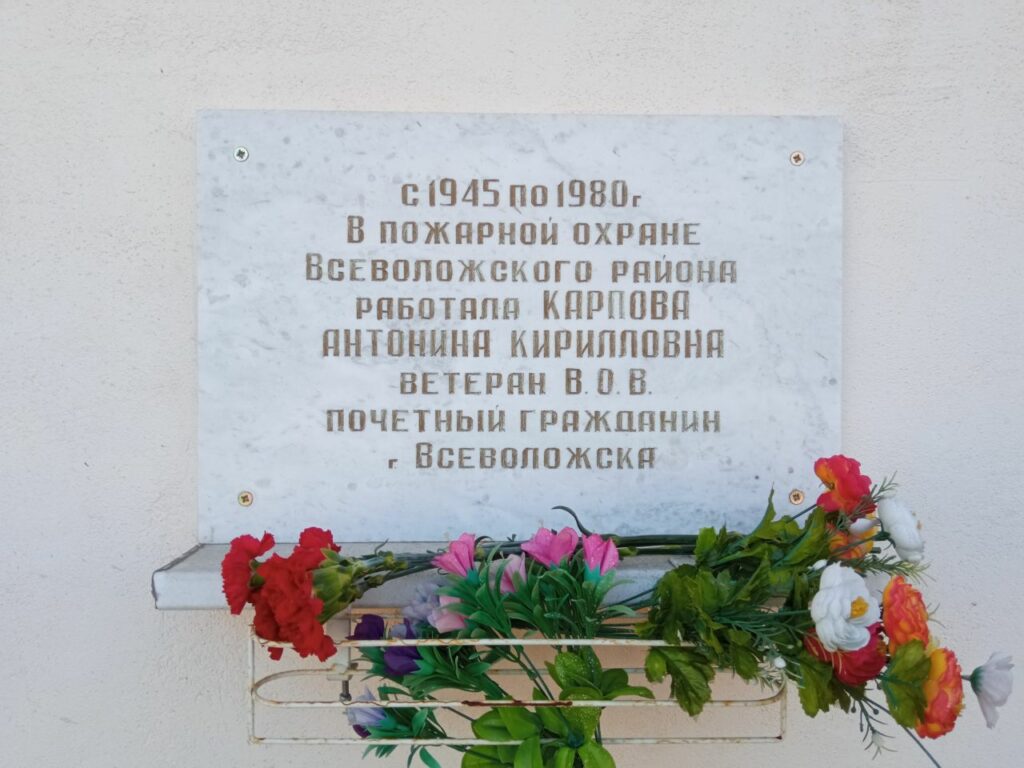 По установлению этой мемориальной доски Валерий Николаевич обратился в 2005 году в администрацию Всеволожского района и получил положительный ответ (Распоряжение администрации МО «Всеволожский муниципальный район» от 05.05.2005 № 876 «Об установке мемориальной доски ветерану Великой Отечественной войны Карповой Антонине Кирилловне»).