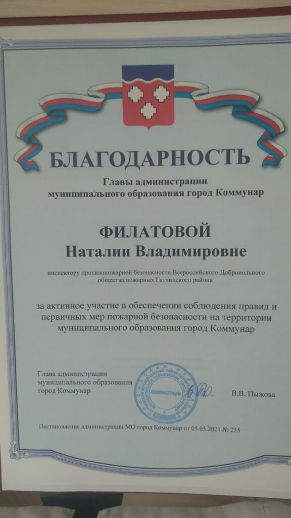 За активное участие в обеспечении соблюдения Правил и первичных мер пожарной безопасности на территории МО «Город Коммунар» Гатчинского муниципального района сотруднику Гатчинского ВДПО Филатовой Н.В. вручили Благодарность.