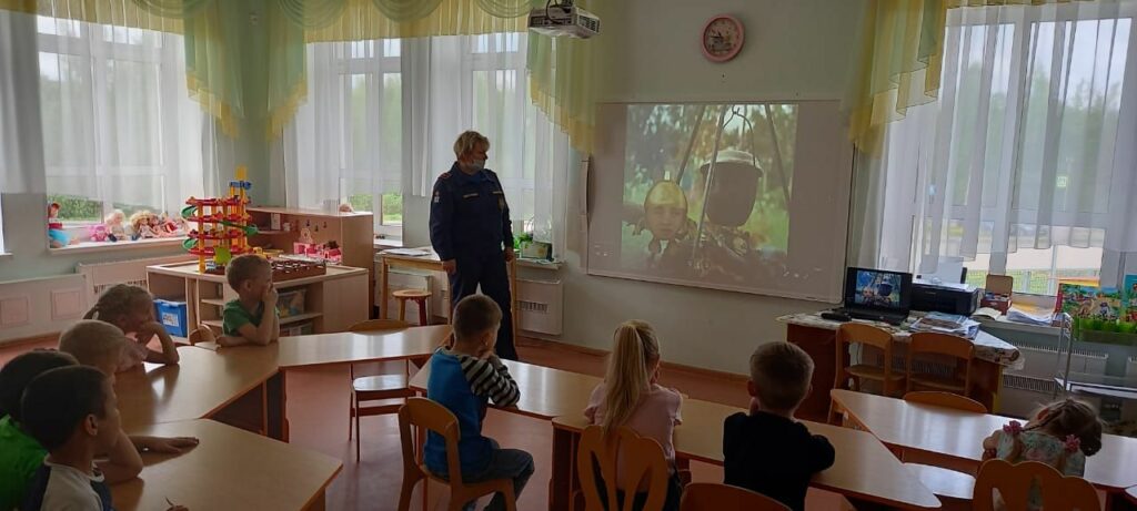 Чтобы закрепить материал, дети посмотрели мультфильм о действиях при пожаре, где вместе с героями выбирались из опасных ситуаций и запоминали базовый порядок спасения жизни и здоровья.