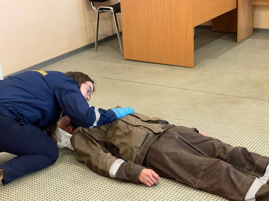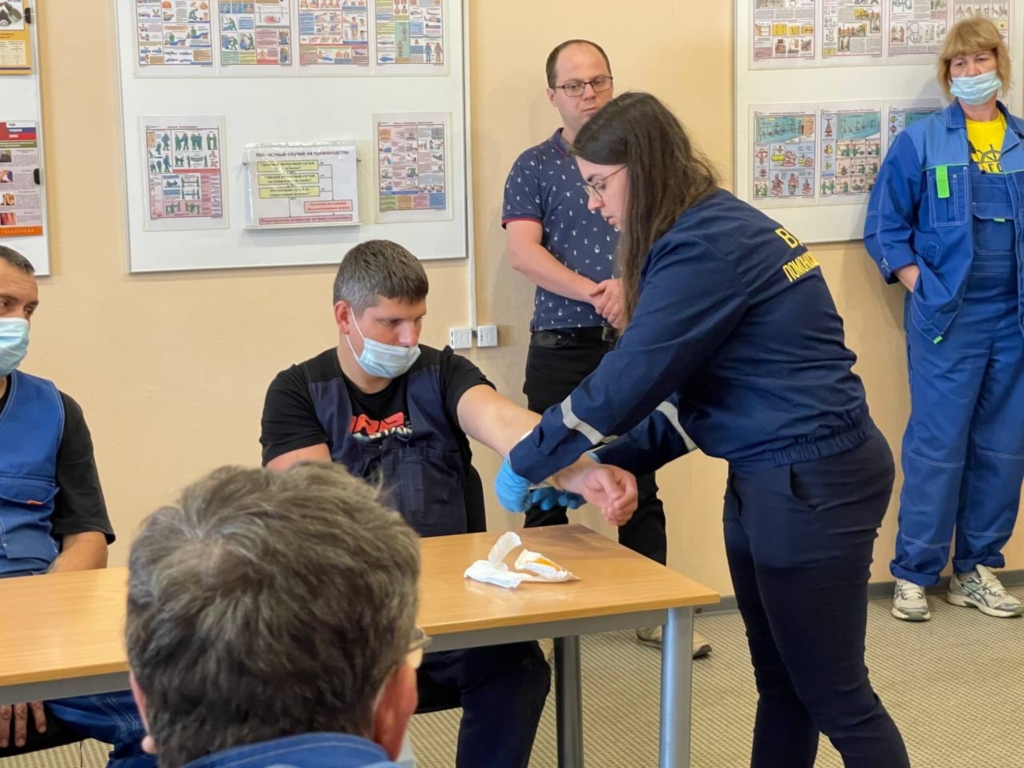 На занятии были затронуты вопросы по оказанию первой помощи пострадавшим при ожогах, при отравлении угарными газами, при травмах, кровотечениях и переломах. Работники организации попробовали сами «эвакуировать» (поднять) пострадавшего, не используя носилок. Умение оказать первую помощь – один из самых важных навыков в чрезвычайной ситуации, который поможет сохранить здоровье и жизнь пострадавшего. Обучение работников предприятия оказанию первой помощи пострадавшим является необходимым условием для обеспечения безопасных условий труда на предприятии.