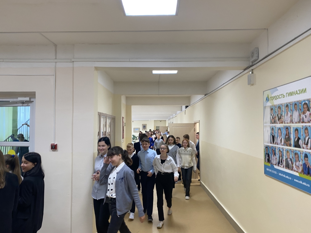 После сигнала тревоги о возникновении условного возгорания, учителя оперативно и слаженно, сохраняя спокойствие организовали выход школьников и сдали информацию о количестве выведенных ими с урока детей с учётом отсутствующих в школе учащихся. Весь персонал действовал строго по инструкции, последний сотрудник Гимназии покинул стены школы спустя 3 минуты и 8 секунд, что полностью соответствует нормативам.