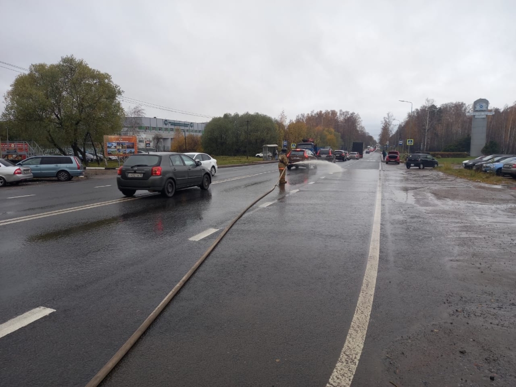 В результате столкновения двух легковых автомобилей Шевроле Ланос и Тойота РАВ4 произошло вытекание охлаждающей и горючей жидкостей из моторного отсека легкового автомобиля Шевроле Ланос. Работники пожарной части ЛМО ВДПО, работая стволом «Б» от АЦ 6,0-40 КАМАЗ, смыли топливо с проезжей части.
