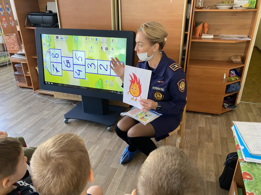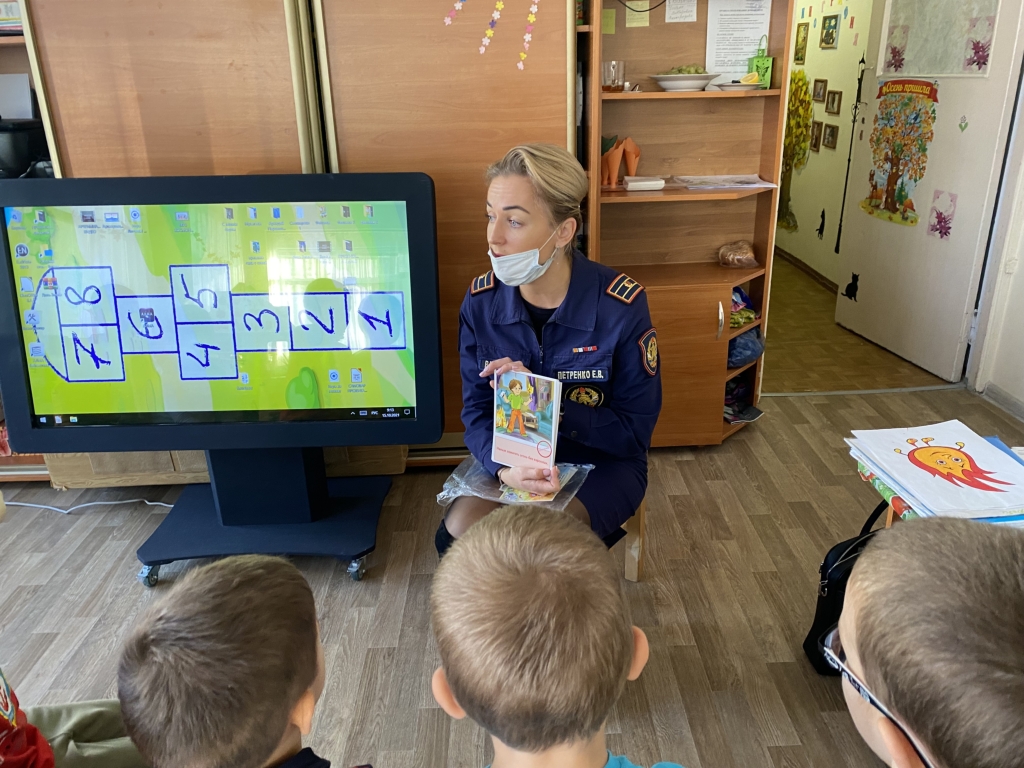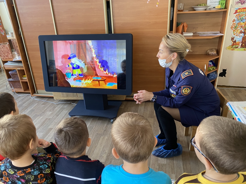 Поскольку детки совсем маленькие, то для лучшего закрепления сложного материала — им включили серию красочных мультфильмов, в которых просто и понятно рассказывались простые правила безопасного поведения – что спички детям не и грушка и с электроприборами играть нельзя, а также какие действия следует предпринимать в случае возникновения пожара.