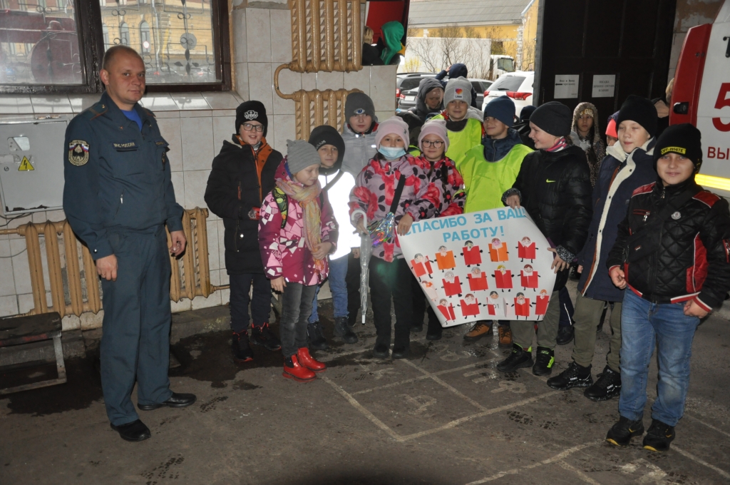 Но самое приятное для сотрудников пожарной части, оказалось то, что ребята подготовили плакат «СПАСИБО за Вашу работу» с номером экстренной службы. Этот плакат сотрудники повесили на почетное место на административном этаже здания.