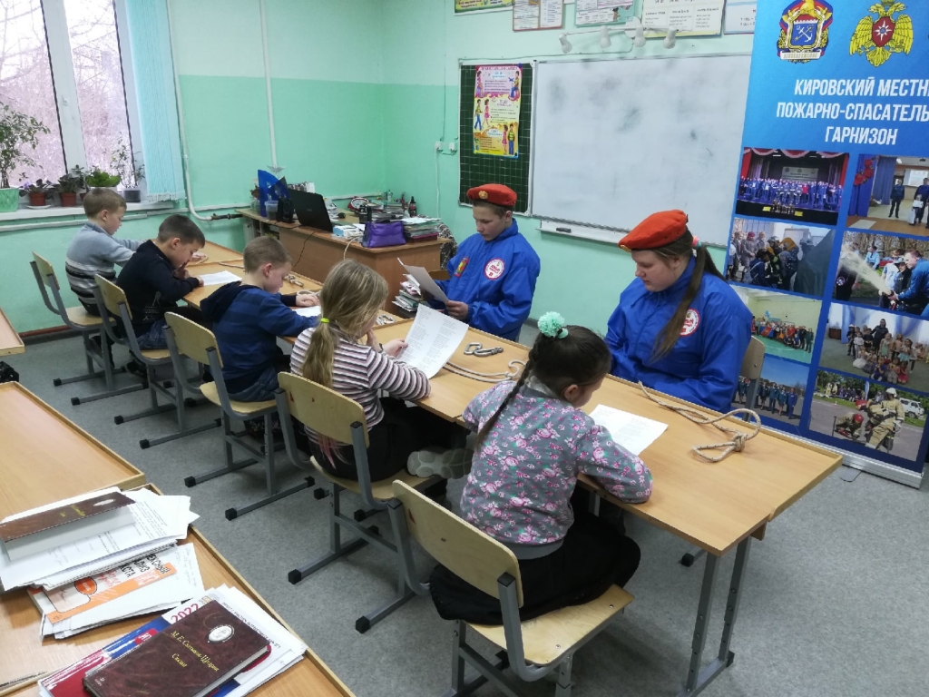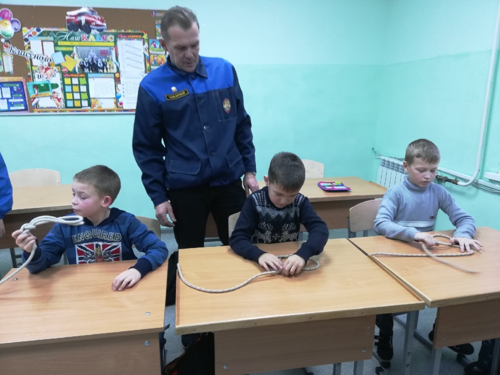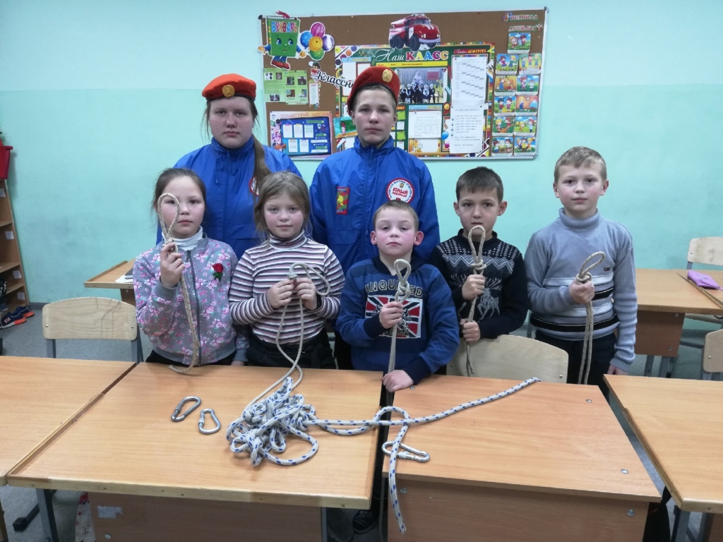 Занятие началось с практической части. Третьеклассники вспомнили историю о мышке и её норке и повторили выполнение узла «булинь». Потом руководитель дружины Громов С. В. показал как выполняется узел «альпийский проводник». Здесь на помощь гномам пришла история о испугавшемся зайце. Помощь юных пожарных и старание ребят принесло хорошие результаты — все гномы научились вязать новый узел.