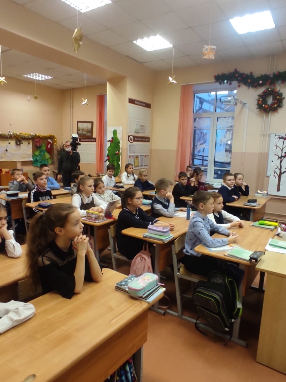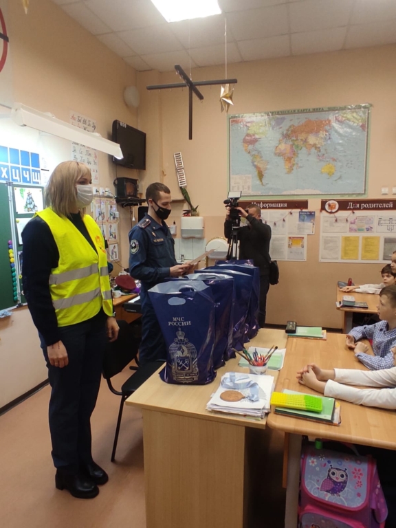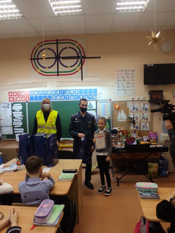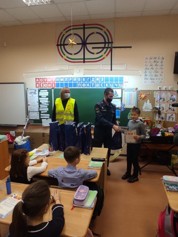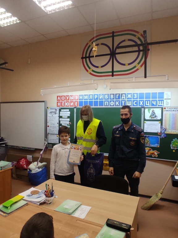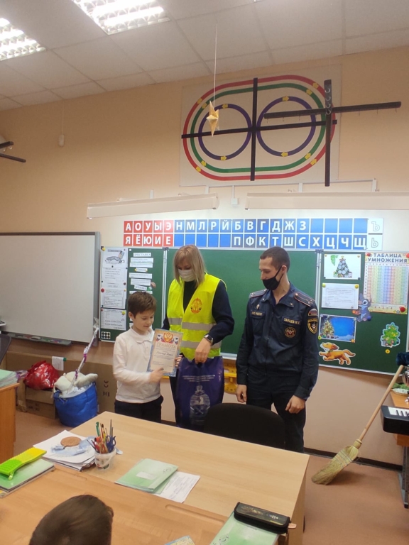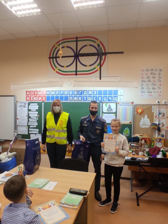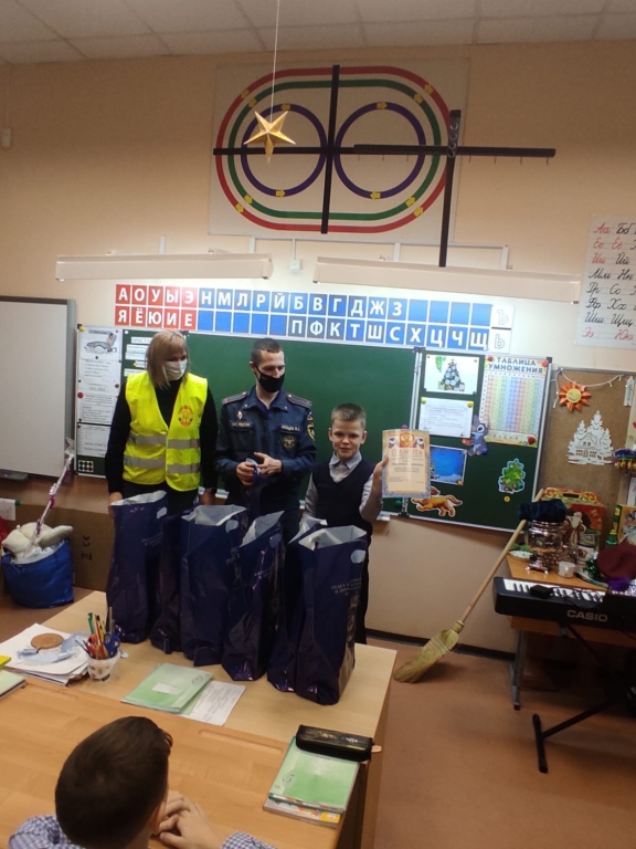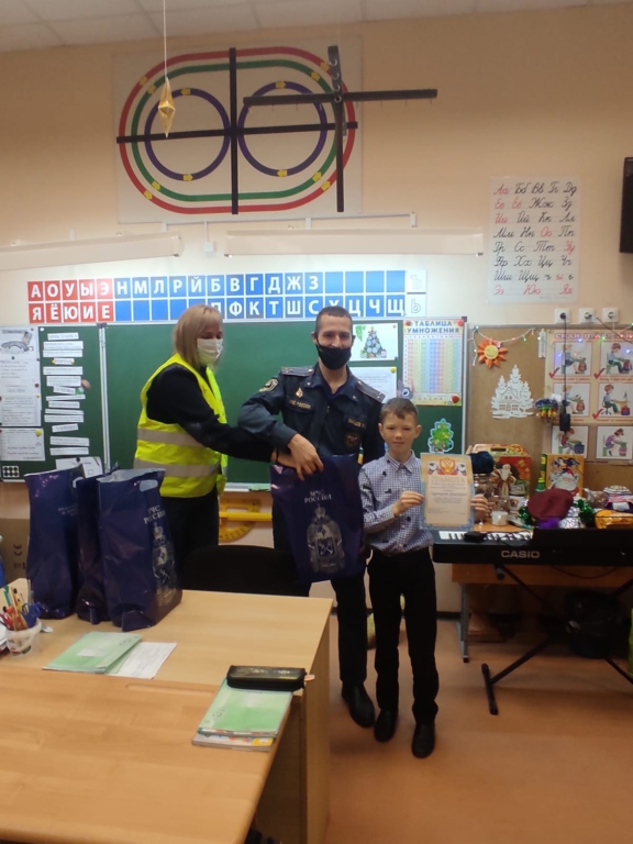 Ребятам вручали подарки в школе и перед всем классном наградили их дипломами и сладкими подарками от Выборгского местного отделения ВДПО ЛО.
