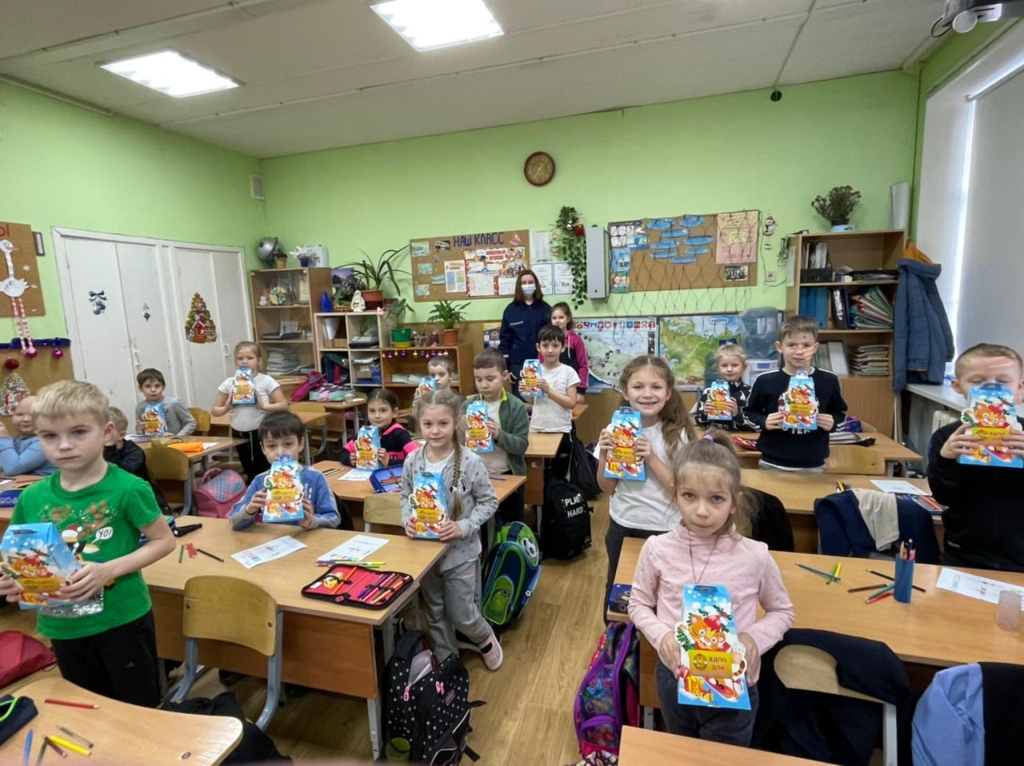 Работники Ломоносовского местного отделения ВДПО продолжают поздравлять детей, посещающих детские сады и школы Ломоносовского района. Так 24 декабря 2021 года работник СОД ЛМО ВДПО Баранова Ксения поздравила первоклассников Кипенской общеобразовательной школы Ломоносовского района Ленинградской области.
