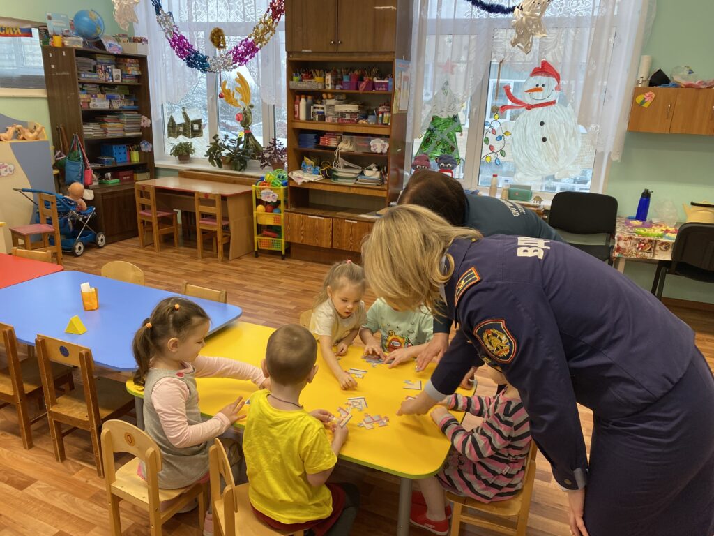 В рамках занятия ребята не только прослушали увлекательные лекции, но и закрепили материал несколькими играми — собрали пазлы на противопожарную тематику и разглядывали красочные картинки, которые иллюстрируют правила.
