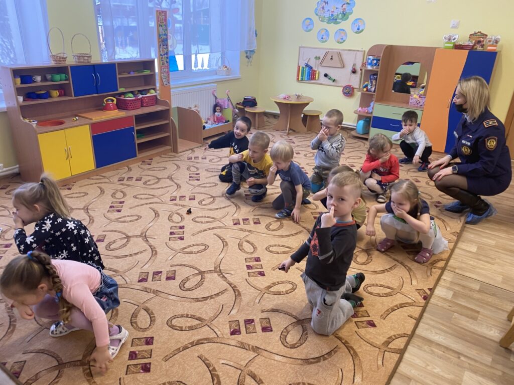 Кроме того, в рамках урока дети учились правильно эвакуироваться в случае пожара в квартире — правильно передвигаться, закрывать органы дыхания влажной тряпочкой.