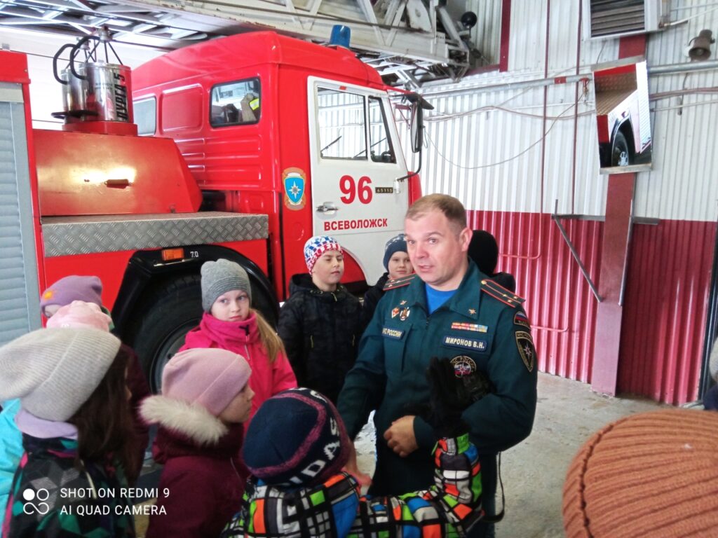 О работе пожарных подразделений Всеволожского района и о мерах пожарной безопасности дома и в школе ребятам рассказали заместитель начальника отряда Миронов Владимир Николаевич и заместитель МО ВДПО Миклин Валерий Николаевич. Пожарную технику и пожарно-техническое вооружение ребятам показали бойцы дежурного караула части. Они разрешили посидеть всем присутствующим в кабине пожарной автоцистерны.