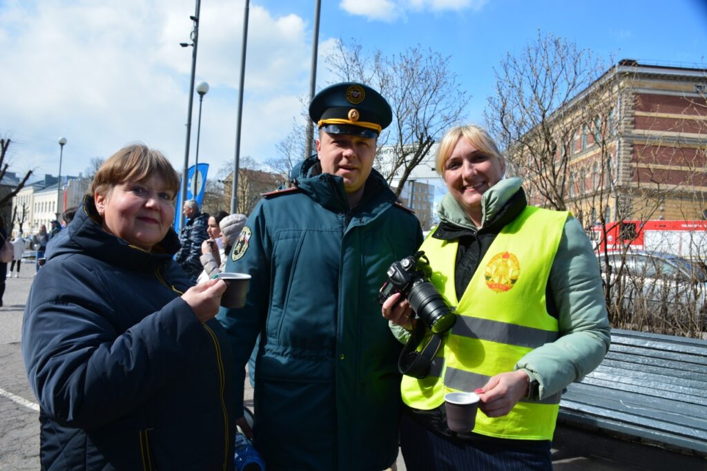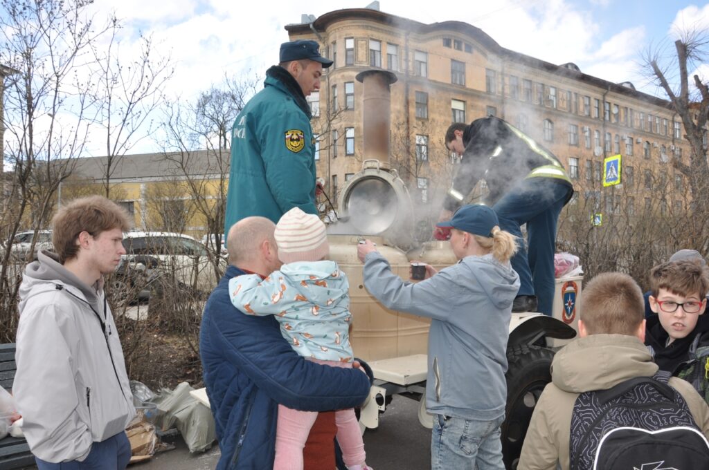 На улице сегодня прохладно, поэтому ребят угощали горячим чаем и предлагали отведать полевую кухню.