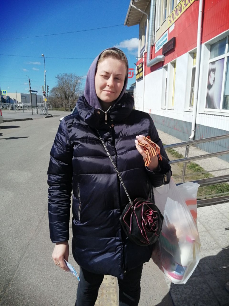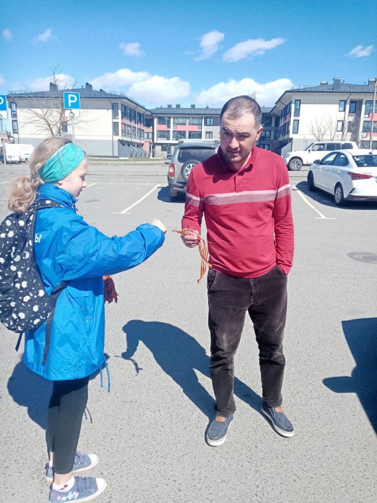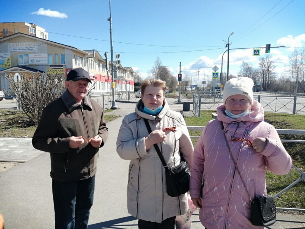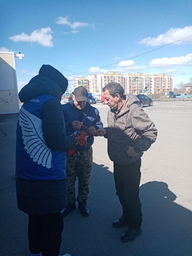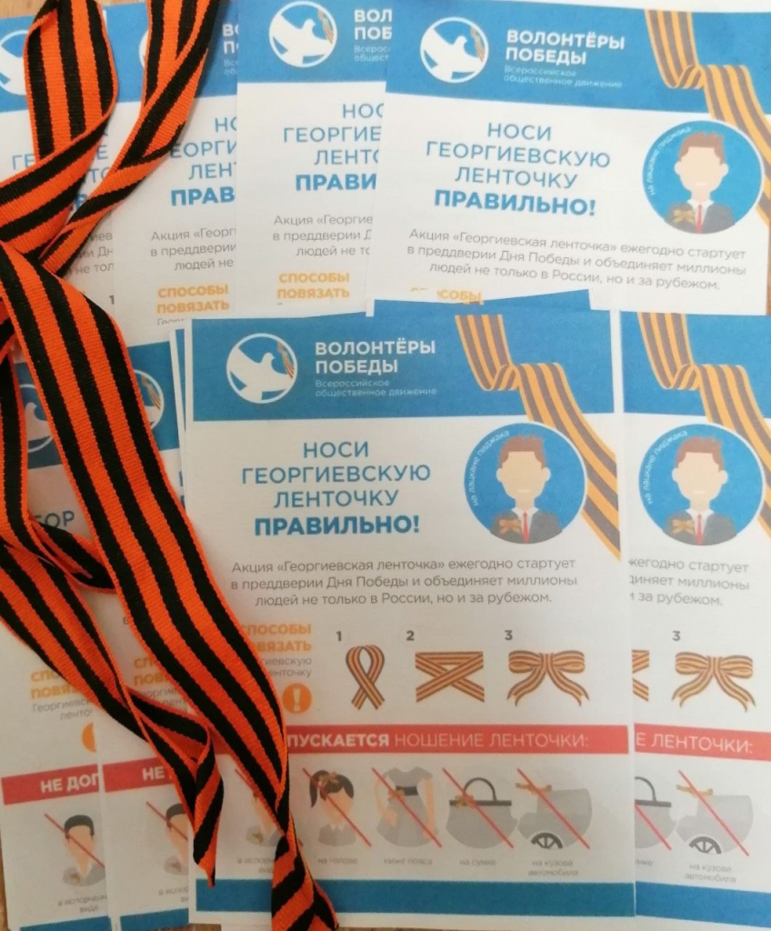 Волонтёры школьного клуба «Вместе делаем добро» совместно с работниками Ломоносовского местного отделения ВДПО вручили жителям символ Победы – Георгиевскую ленточку и памятки, как правильно ее носить.