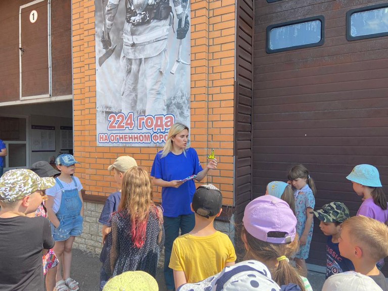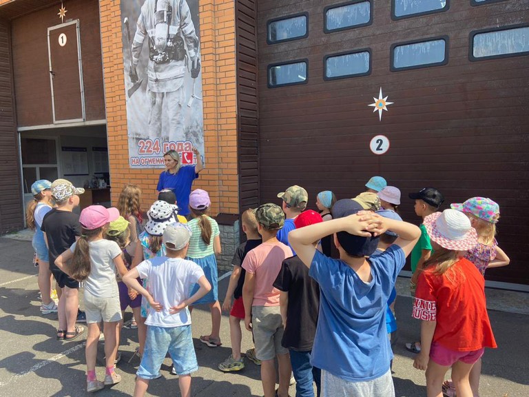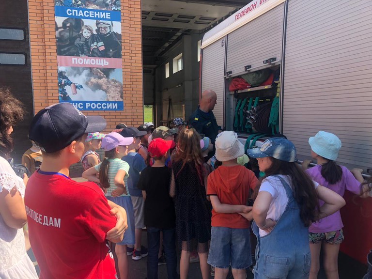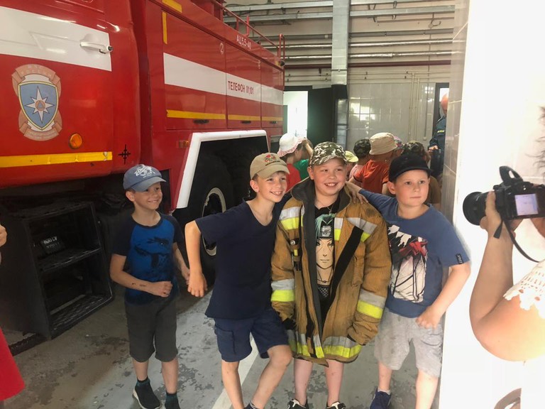 Сотрудники Гатчинского местного отделения ВДПО ЛО решили тоже предложить свои услуги детскому лагерю, пригласив ребят в пожарную часть города Гатчина. Чтобы совместить приятное с полезным — для детей была организована не только экскурсия с показом транспорта, но и проведена  интересная беседа по пожарной безопасности. Детям также  рассказали для чего нужна героическая профессия пожарного, мальчишки сразу сказали, что они тоже будут защищать людей от пожара. Да и девочки не отставали от ребят.