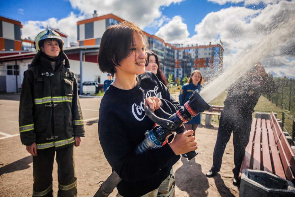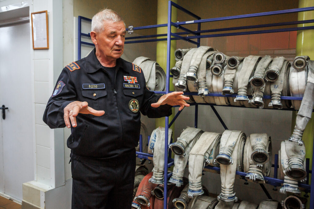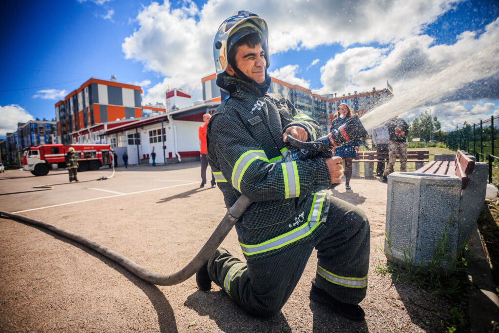Были организованы практические занятия по надеванию боевой одежды пожарного, пожарного снаряжения и аппаратов на сжатом воздухе. От автоцистерны была проложена магистральная и рабочая линии и организовано тушение условного пожара.