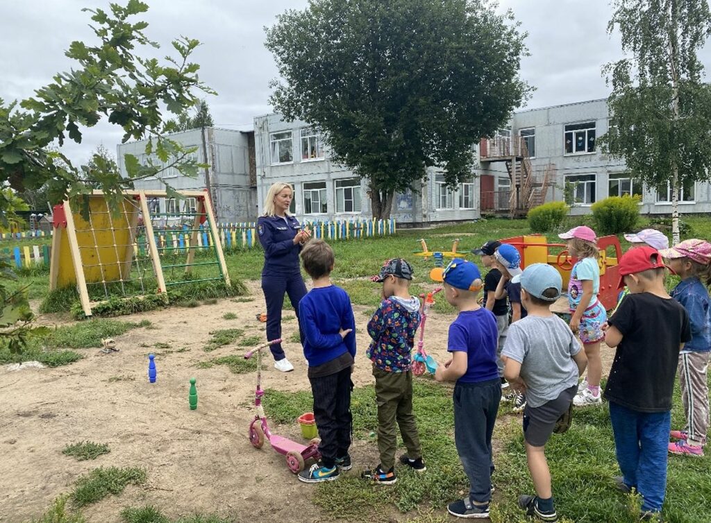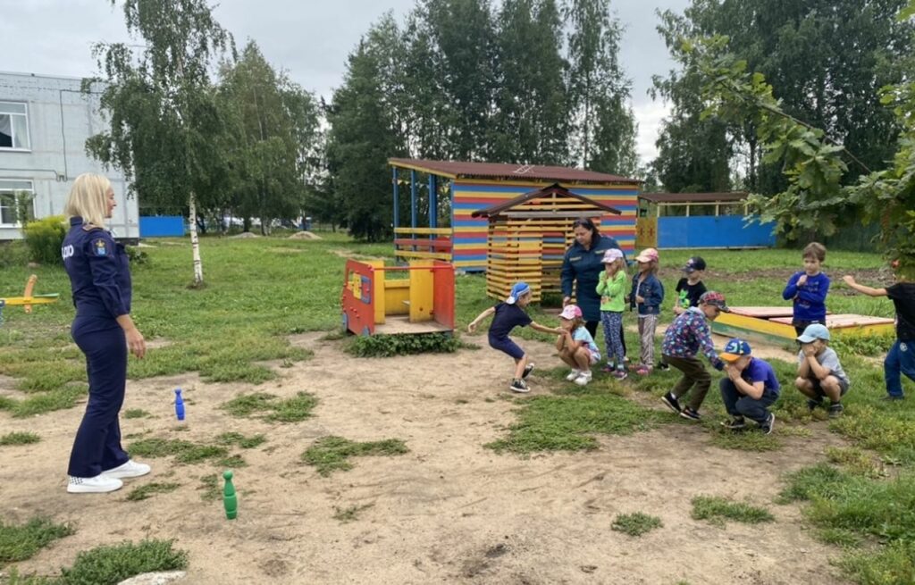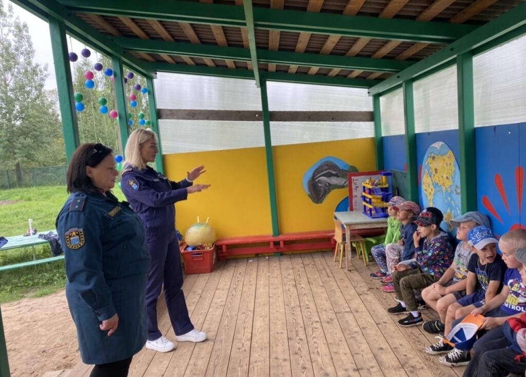 Воспользовавшись последними теплыми летними днями, гостьи предложили ребятам устроить практическое занятие прямо на улице – и примерить на себя роль настоящих огнеборцев!