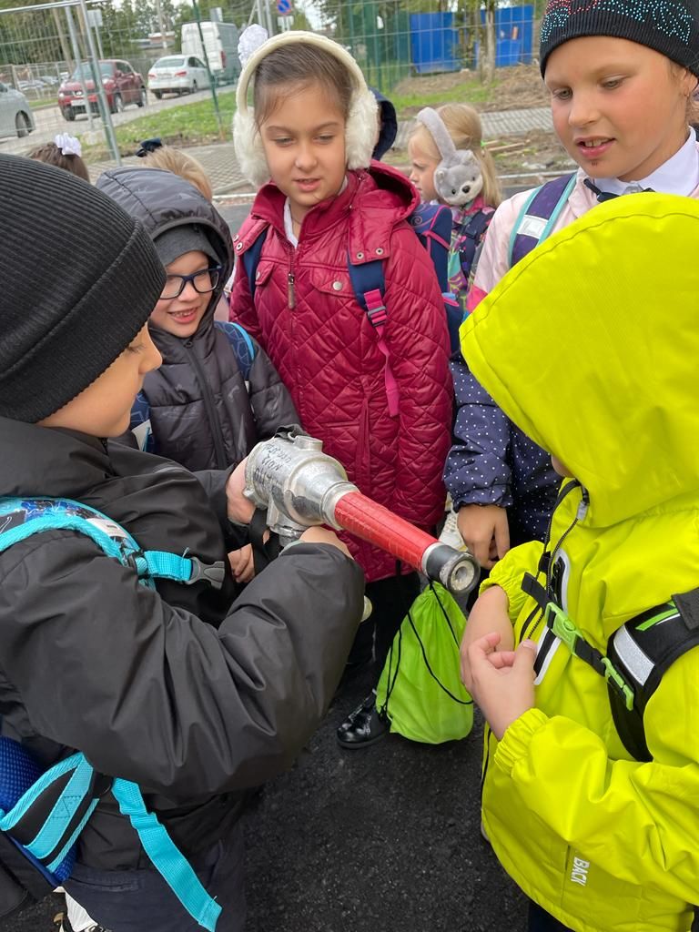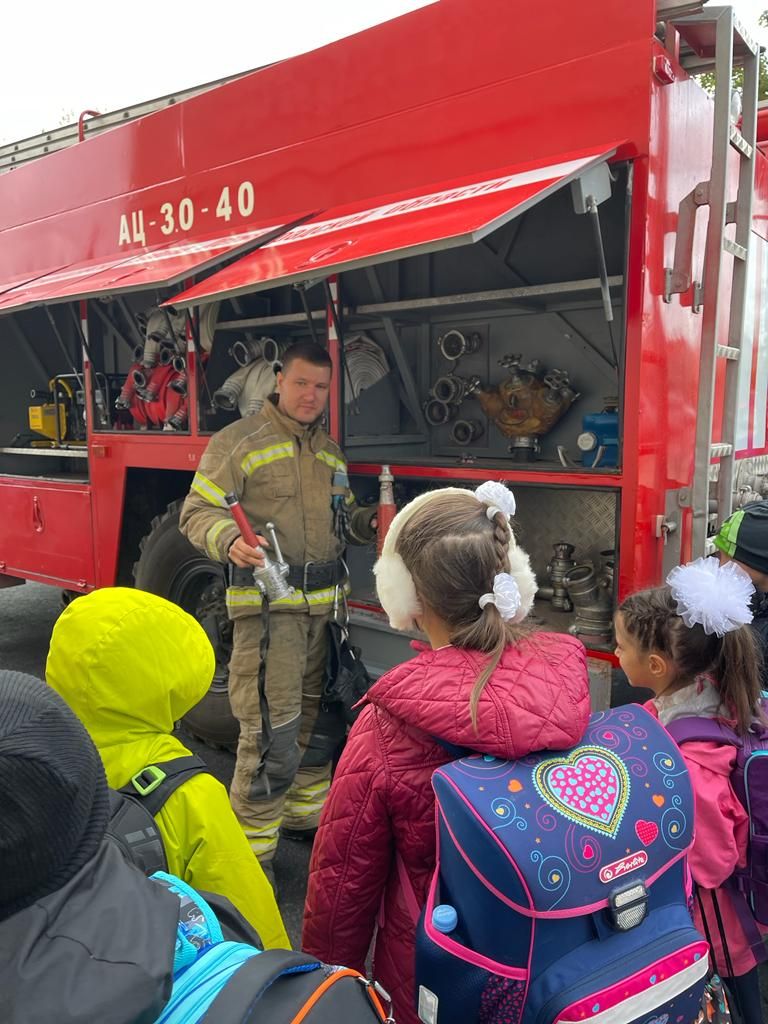 Учащимся показали пожарную машину, оборудование, которым укомплектована машина – аварийно-спасательный инструмент, средства индивидуальной защиты, ручные стволы пожарные рукава, краны и боевую одежду пожарного. Ребята примерили на себя каски, посидели в кабине пожарной машины, сфотографировались на память. Работники пожарной части вспомнили с ребятами правила, которые необходимо соблюдать, чтобы не допустить пожара. У учащихся прошел познавательный и интересный урок на открытом воздухе.