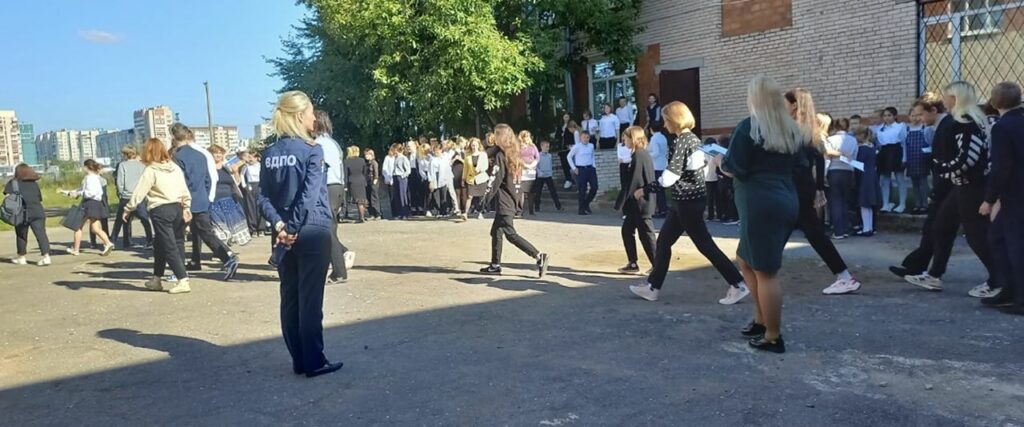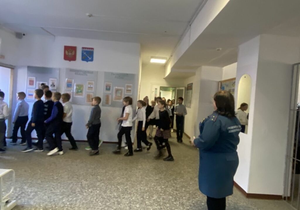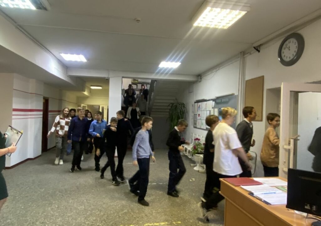 После сигнала тревоги и срабатывания системы оповещения, педагоги успокоили свои классы и оперативно вывели их через эвакуационные выходы перед зданием школы, минуя опасную зону «условного» возгорания.