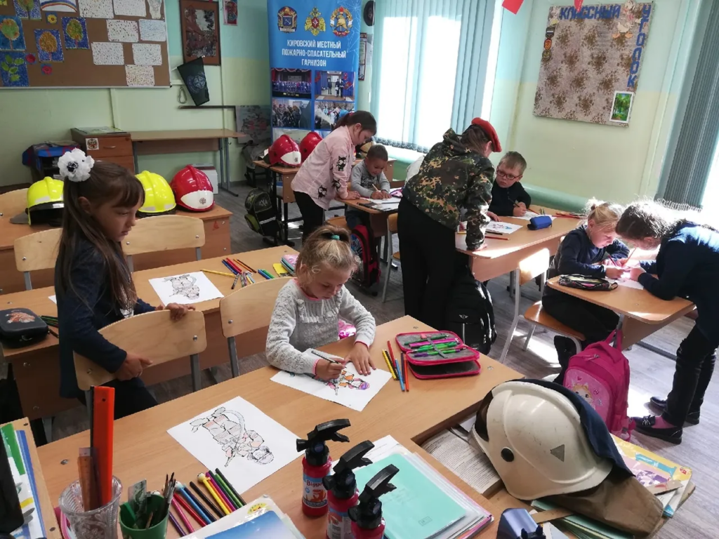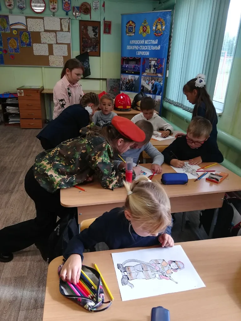В завершении встречи ребята работали с раскрасками — раскрашивали боевую одежду огнеборца. И наконец каждый примерил настоящую боевую пожарную каску. В работе с малышами добровольцу помогла Валерия К. — юный пожарный инструктор.