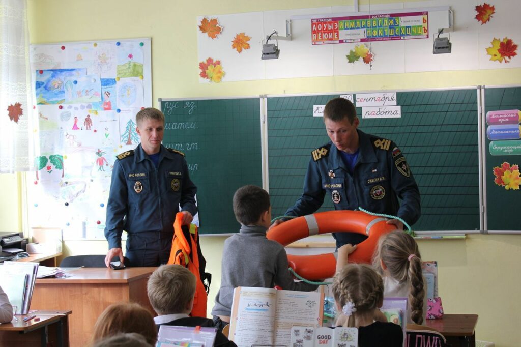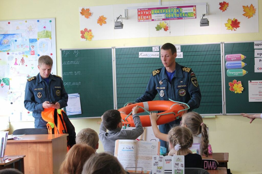 Государственные инспекторы Кировского отделения Центра ГИМС Главного управления МЧС России по Ленинградской области — Илья Ожигин и Константин Писарев, продемонстрировали ребятам специальные спасательные средства на воде: круг, жилет и рассказали как правильно ими пользоваться, в заключение повторили с детьми основные правила поведения на водоемах в летний и зимний периоды.