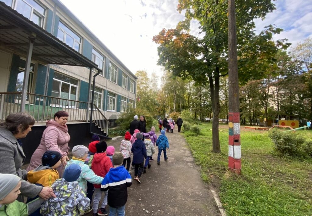 Во второй части встречи перешли к эвакуации — чтобы отработать на практике порядок действий. Условное возгорание произошло в прачечной — по сигналу тревоги все воспитатели быстро собрали ребят и по безопасным путям направились к выходу из здания на точку общего сбора.