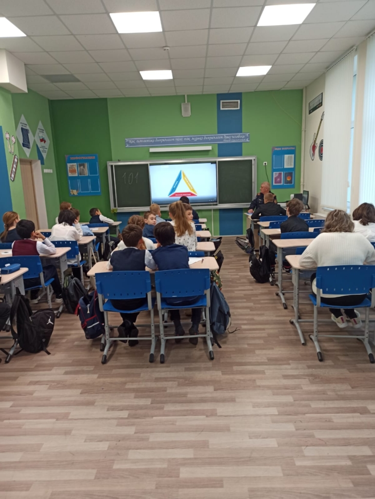 Вместе с Клавдией Валентиновной вводный урок в курсе «Безопасное поведение в ситуациях, связанных с пожарами» в 5 классе провели заместитель председателя совета местного отделения ВДПО ЛО Миклин В.Н. и инструктор противопожарной профилактики Чернова В.В.