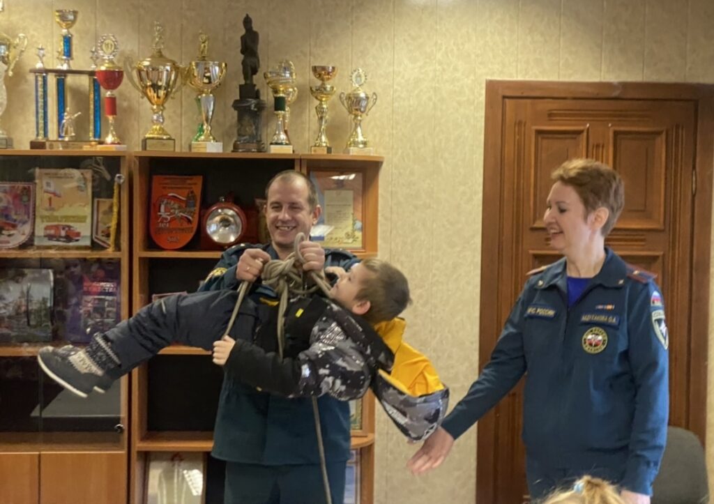 Илья Зорькин продемонстрировал на одном из воспитанников, как проводится обмотка веревкой! Дети затаив дыхание наблюдали за процессом, а потом засыпали своего экскурсовода дополнительными вопросами — им хотелось знать все-все про то, какие еще способы спасения во время пожара существуют.