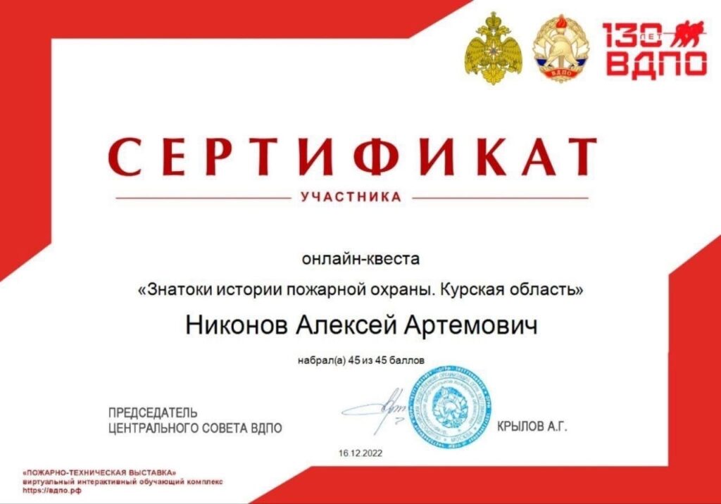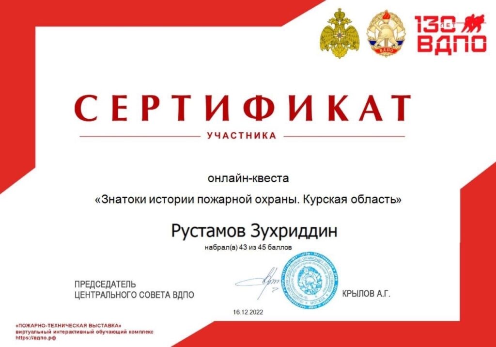 Приветствуем учеников кадетского класса МЧС МКОУ «Красноборская СОШ» – Никонова Алексея, Рустамова Зухриддина, Казиев Ратмира с лучшими результатами прохождения онлайн-квеста «Знатоки истории пожарной охраны. Курская область» среди членов ДЮП «Спасатели» Красноборской школы.