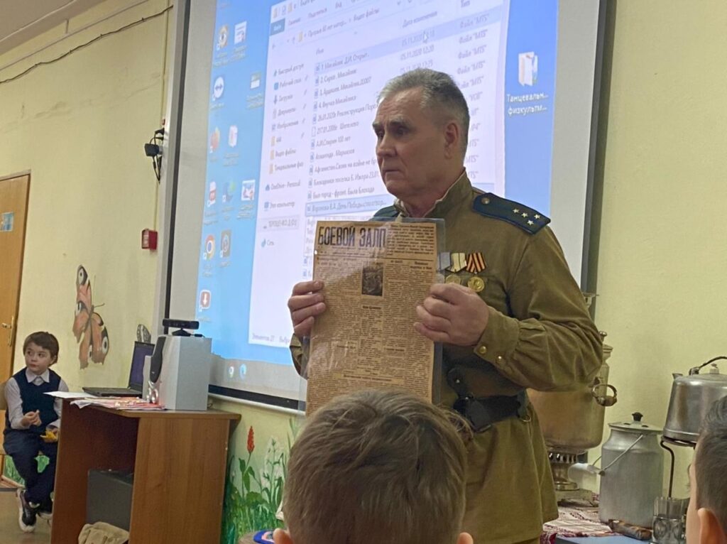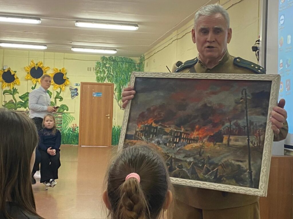 Виктор Васильевич организовал выставку предметов быта того времени из своего частного музея, показал детям печатные издания тех времен, картину, написанную ветераном, участником тех страшных событий.