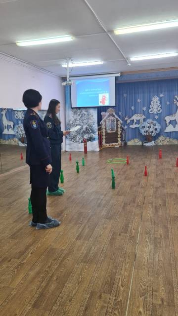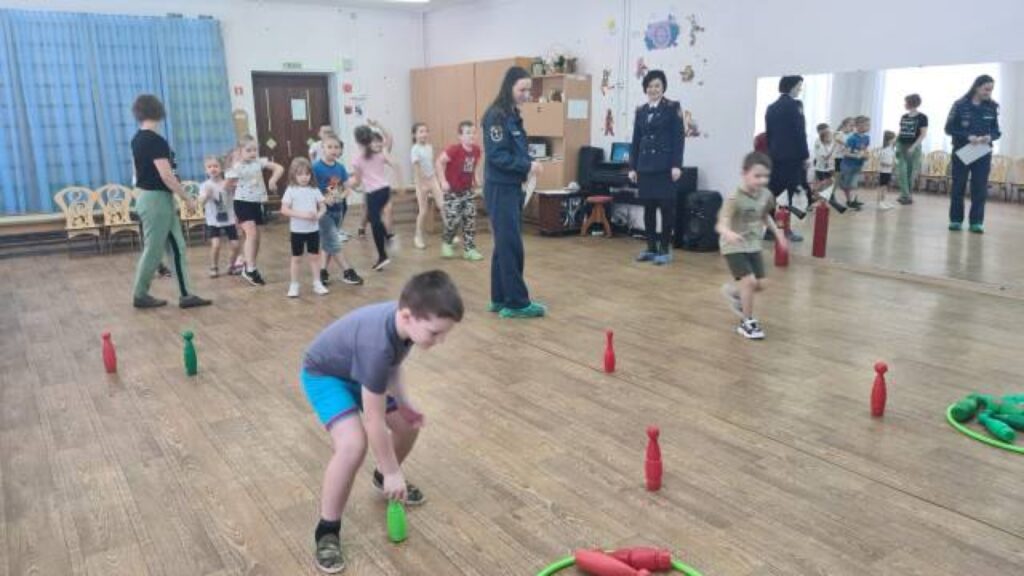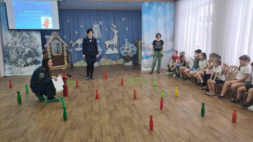 Игра с «огнетушителями» (кеглями) — необходимо было потушить очаг пожара, собрав все кегли определенного цвета.