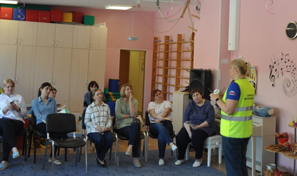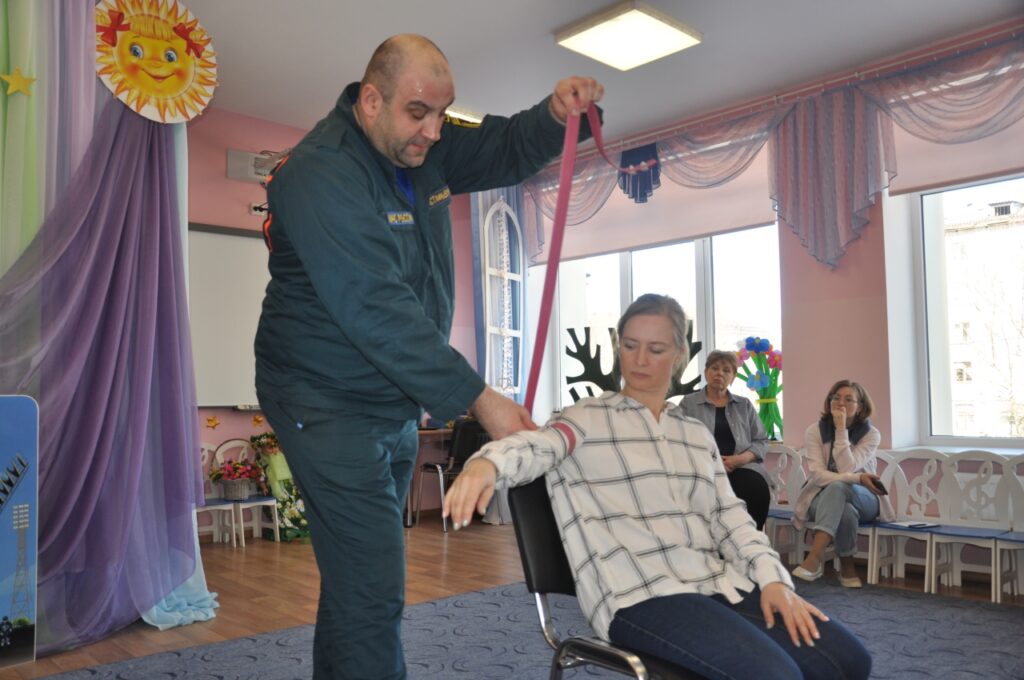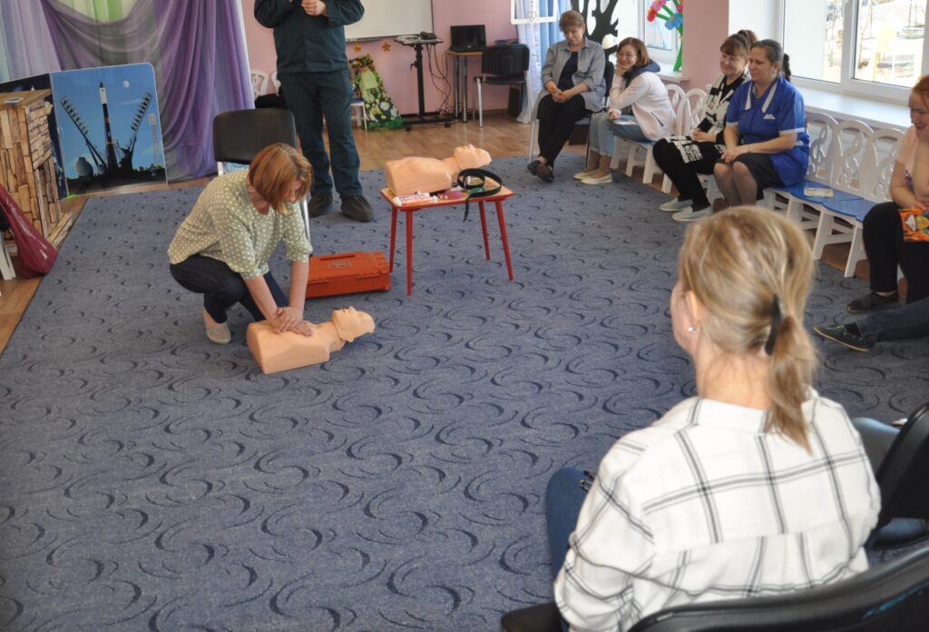 Сотрудникам детского сада во время тихого часа рассказали про виды ожогов и кровотечений, как действовать при переломе конечностей и повреждений артерий. Кроме этого, после соответствующих вопросов, объяснили, что делать при утоплениях и потери сознания. А также наглядно продемонстрировали реанимационные действия, показали, как правильно накладывать жгут и давящую повязку, и как спасти человека, если он поперхнулся.