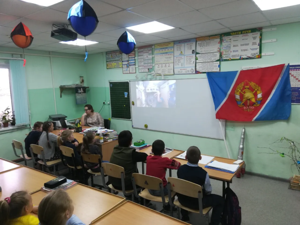 Затем ребята узнали о том, как работают и живут на МКС космонавты в наши дни. В видеоролике лётчик — космонавт Дмитрий Петелин подробно описал работу космонавта.