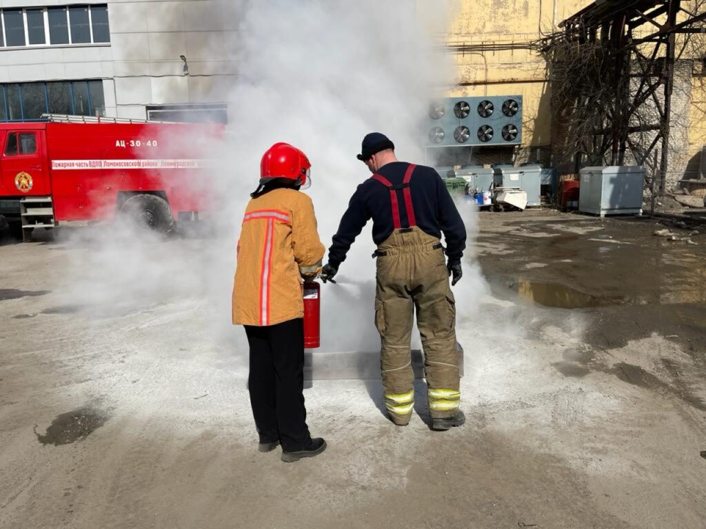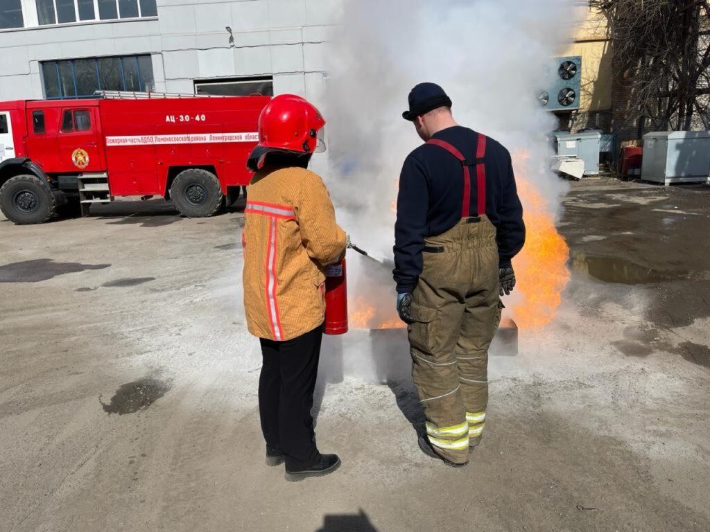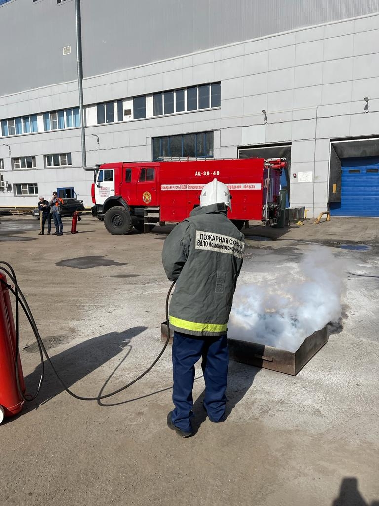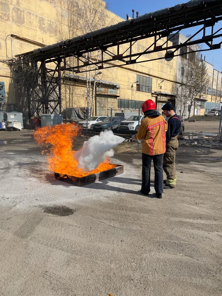 На втором этапе прошло теоретическое и практическое занятие о правилах работы с огнетушителями. После инструктажа по использованию первичных средств пожаротушения сотрудники объекта отработали правила тушения открытого огня (тушение горящего противня), используя огнетушители под руководством работников пожарной части ЛМО ВДПО ЛО. Тренировка прошла успешно, персонал объекта продемонстрировал хорошие знания и грамотные действия.