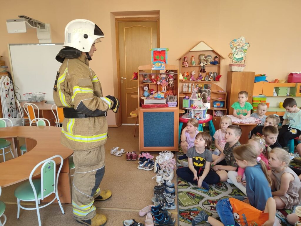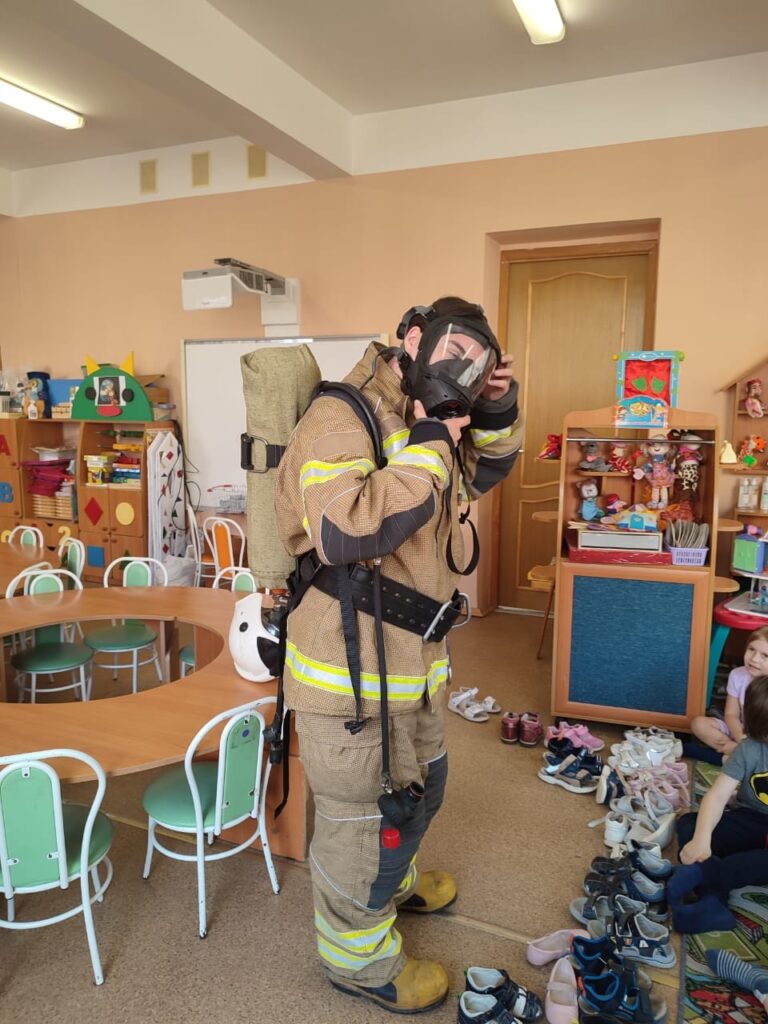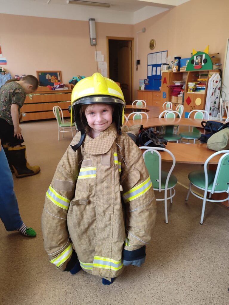 Настя рассказала детям о профессии пожарного, показала боевую одежду пожарного, объяснила, от чего она защищает и как помогает. Ребята сами примерили спецодежду, ощутив себя в роли пожарных. А также в очередной раз повторили правила пожарной безопасности и правила поведения на улице, в парке, в лесу.