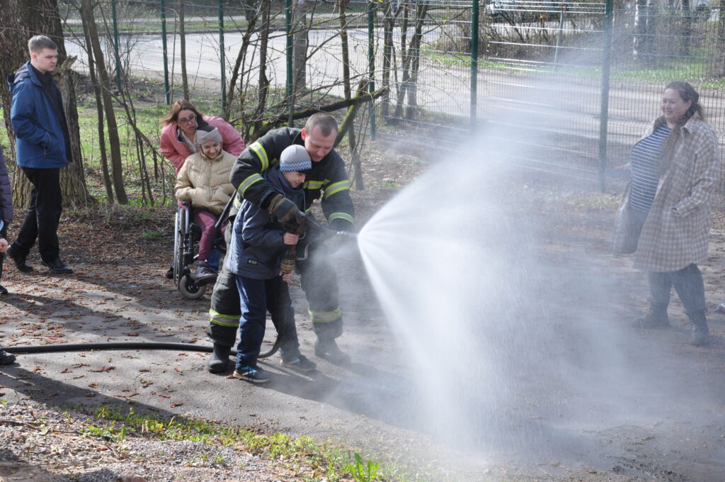 Дети очень ждали пожарную машину, с восторгом встретили пожарных и обнимались постоянно. Сотрудники рассказали из чего состоит пожарный автомобиль, боевая одежда пожарного и дали возможность ребятам поливать со ствола высокого давления.