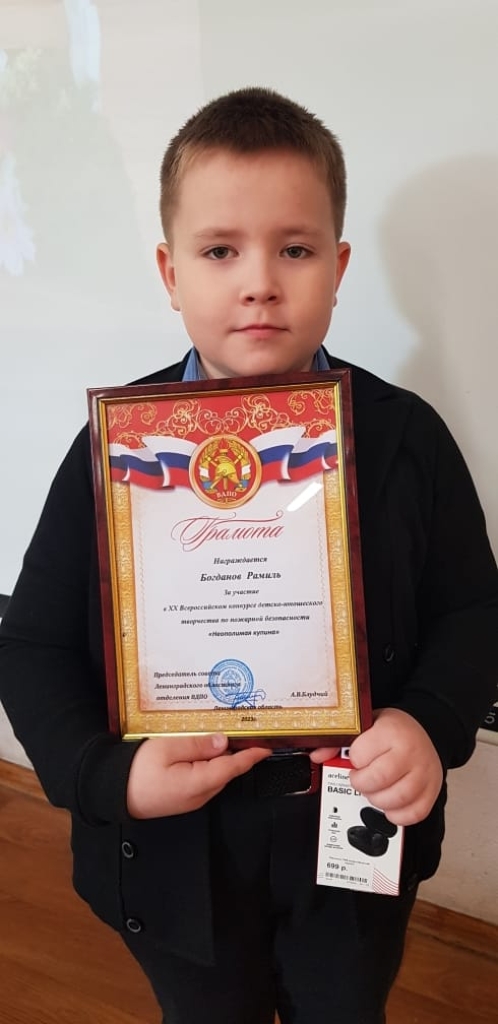 Ученик 3 класса Богданов Рамиль за работу «Срочный вызов» в конкурсе декоративно-прикладного творчества «Неопалимая купина» также был награжден грамотой совета ВДПО Ленинградской области и ценным подарком.