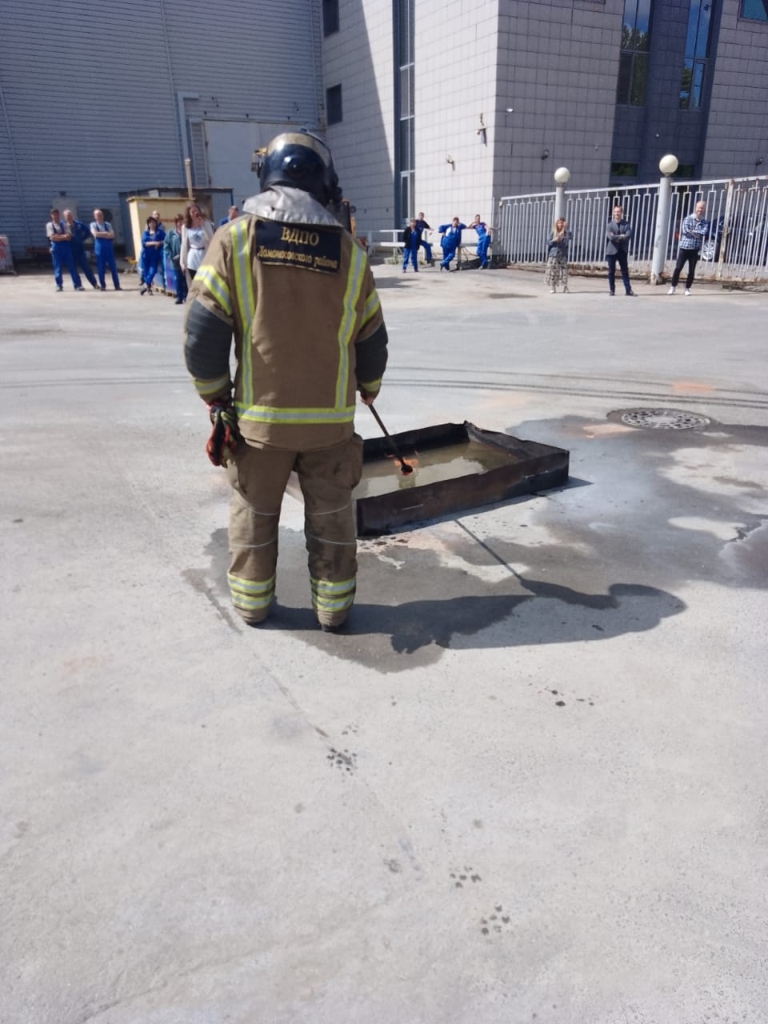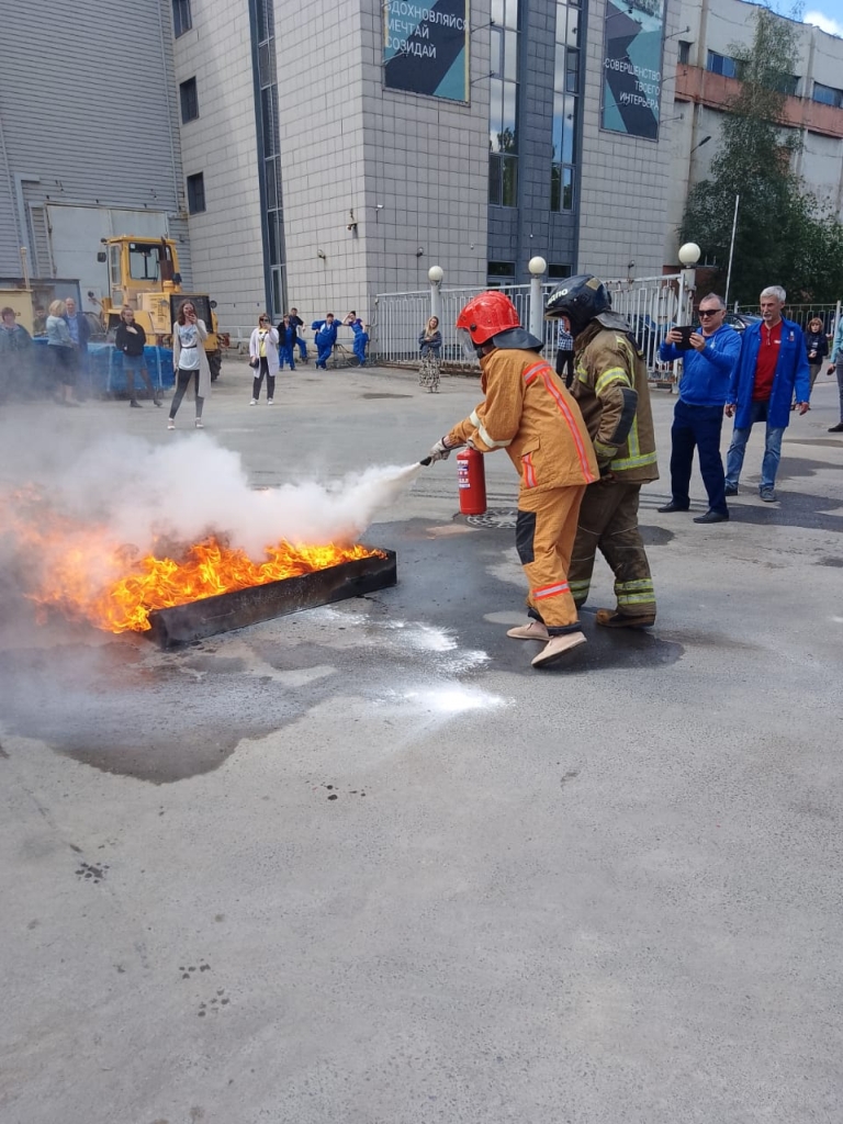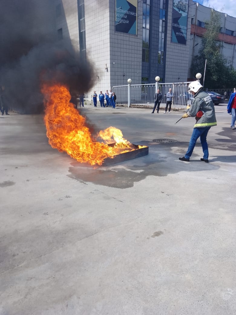Сначала сотрудникам провели инструктаж, рассказав о разных типах огнетушителей и их назначении, объяснив основные тактические приемы работы с огнетушителями. Далее на практике отработали тушение открытого огня – горящего противня.