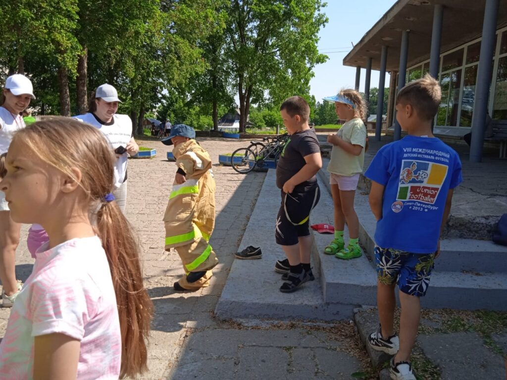 Дети отгадывали загадки на тему пожарной безопасности, а также провели эстафету с тушением импровизированного костра (клумба).