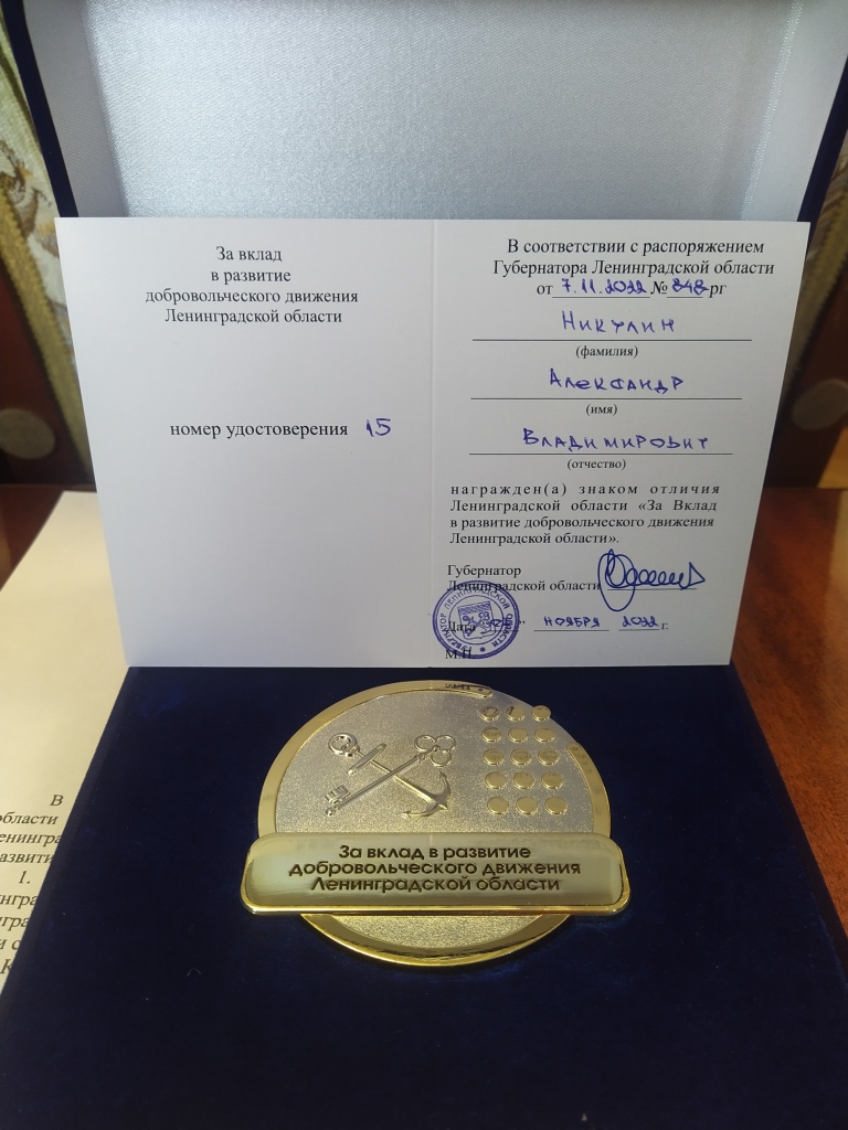 В ходе встречи Председатель комитета по сохранению культурного наследия Владимир Цой отметил Председателя совета Кировского местного отделения Ленинградского областного отделения Общероссийской общественной организации «Всероссийское добровольное пожарное общество» Александра Никулина наградой по итогам работы молодежного Парламента Ленинградской области за 2022 год. Александру Владимировичу была вручена награда – знак отличия Ленинградской области «За вклад в развитие добровольческого движения Ленинградской области».