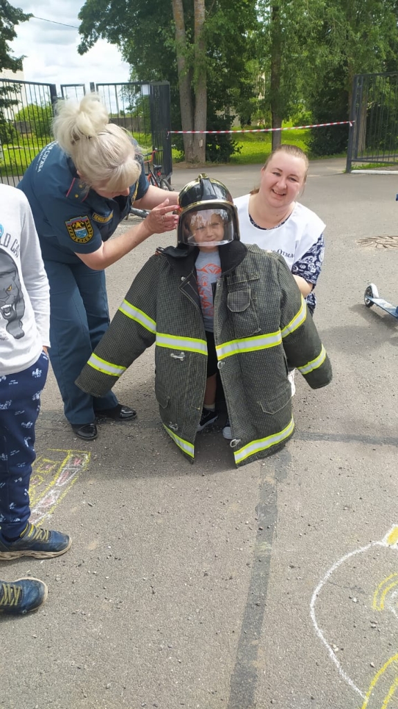 После весёлых игр, ребята рисовали на асфальте рисунки на тематику мероприятия. А после чего надевали настоящее обмундирование пожарных.