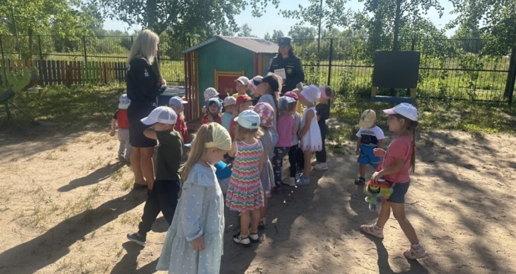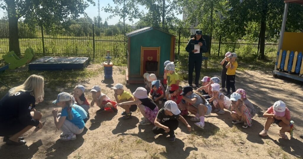 Особое внимание уделили действиям на случай возгорания. Дети не только вспомнили, как важно себя вести, но и немного потренировались во второй части встречи — учились передвигаться в задымленном помещении, правильно защищать органы дыхания.