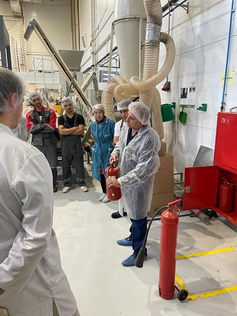 Сейран Георгиевич объяснил сотрудникам правила использования первичных средств пожаротушения, разъяснил классификацию огнетушителей в зависимости от очага возгорания. Показал, как правильно прокладывать рукавную линию для подачи воды к месту пожара. Продемонстрировал универсальное средство индивидуальной защиты от оксида углерода, дыма и других опасных химических веществ, которые образуются в процессе горения при пожарах – Шанс. Показал и рассказал принцип работы пожарных извещателей, пояснил необходимость их установки в помещениях.