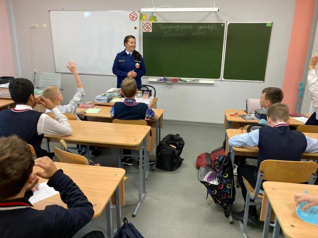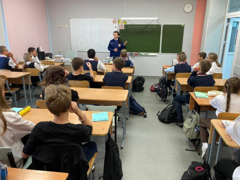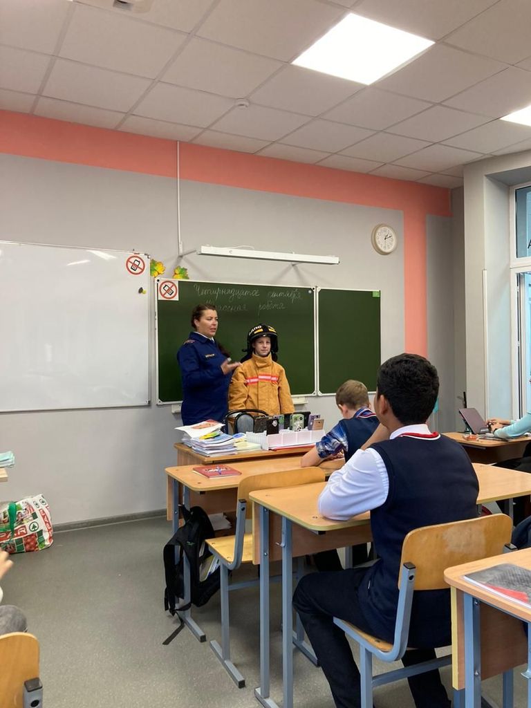 14.09. 2023 г. Инструктор по противопожарной профилактике Ломоносовского местного отделения ВДПО ЛО Ахмадуллина О.В. провела в рамках Месячника по пожарной безопасности урок для 6 «б» класса Ропшинской школы.