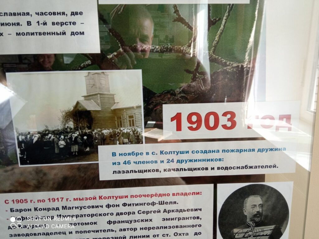 Данную информацию удалось узнать у директора музея Колтушской школы, который показал фотографию тех времен. Надпись на фотографии гласила, что в ноябре 1903 года в с. Колтуши создана дружина из 46 членов и 24 дружинников: лазальщиков, качальщиков и водоснабжателей.