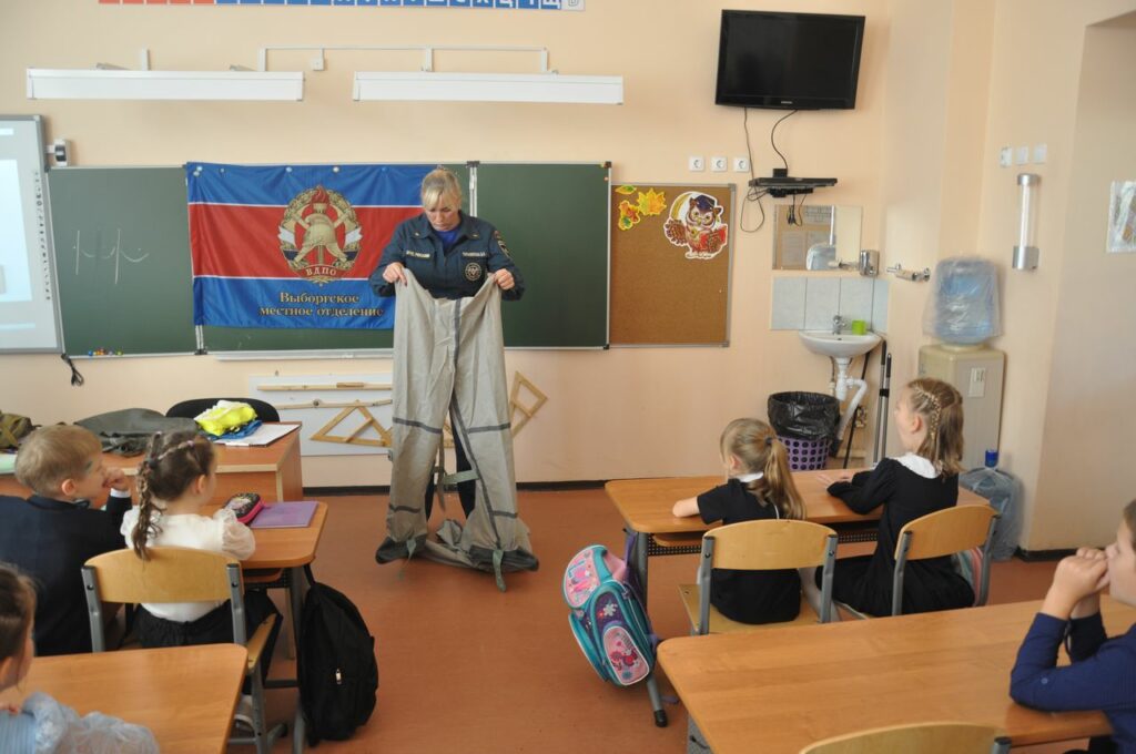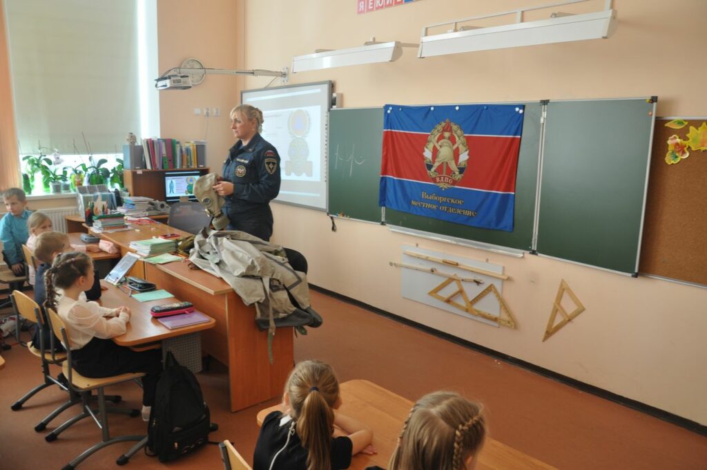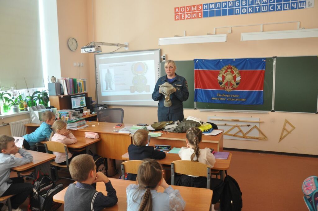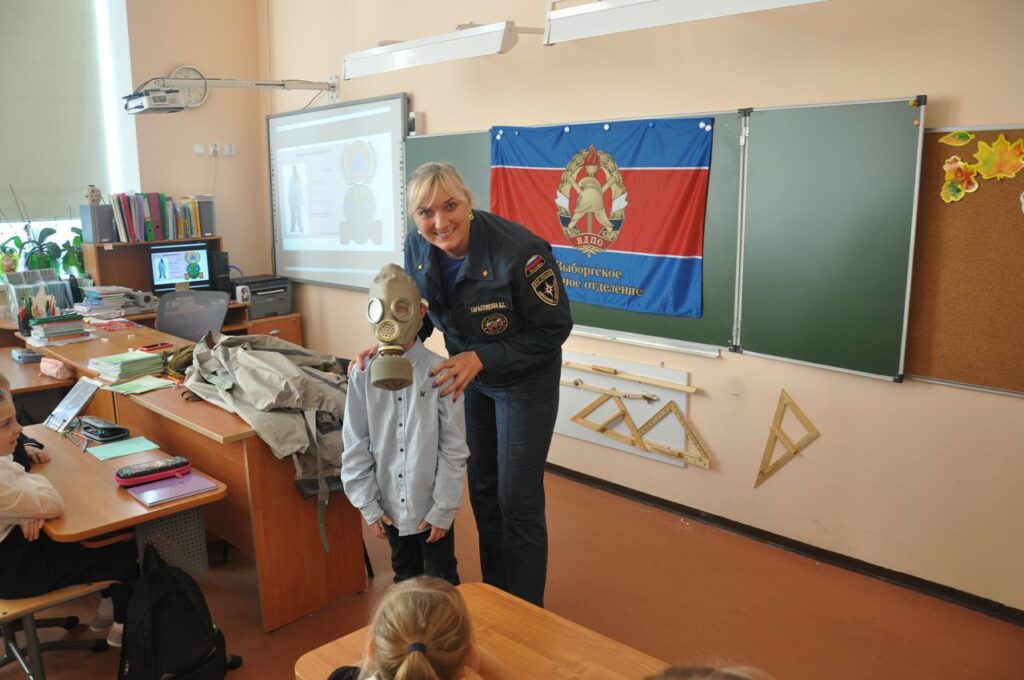 Сотрудники 26 пожарно-спасательного отряда Главного управления МЧС России, совместно с Отделом надзорной деятельности и профилактической работы по Выборгскому району и Выборгским местным отделением Всероссийского добровольного пожарного общества Ленинградской области посетили 2 “А” класс МБОУ СОШ №1 города Выборга с открытым уроком, чтобы рассказать и показать что же такое Гражданская оборона.