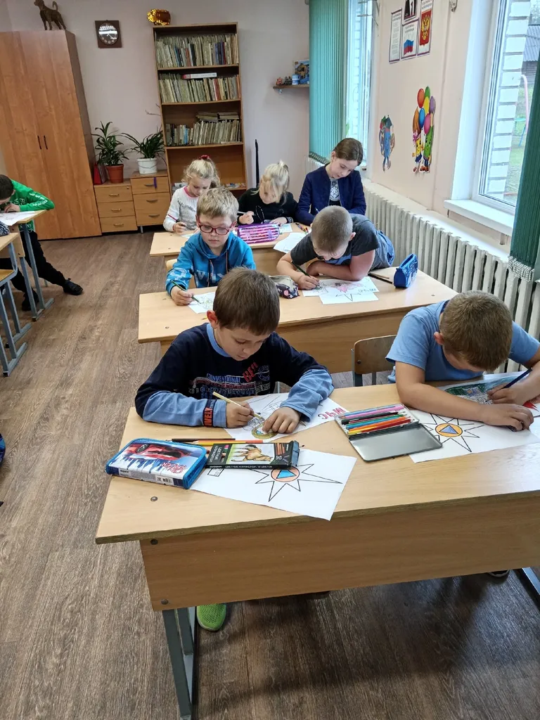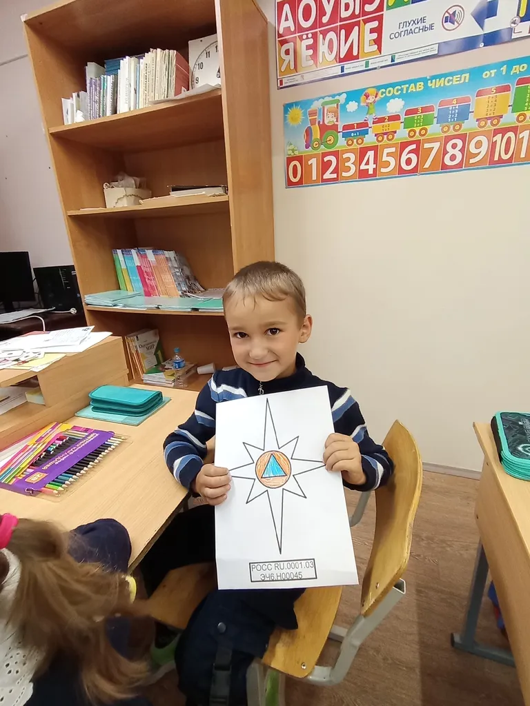 Не обошлось и без творческих заданий, ребята выполнили раскраску символа МЧС России — Белой звезды Надежды и Спасения. Именно в её центре расположен отличительный знак ГО — голубой треугольник в круге оранжевого цвета.