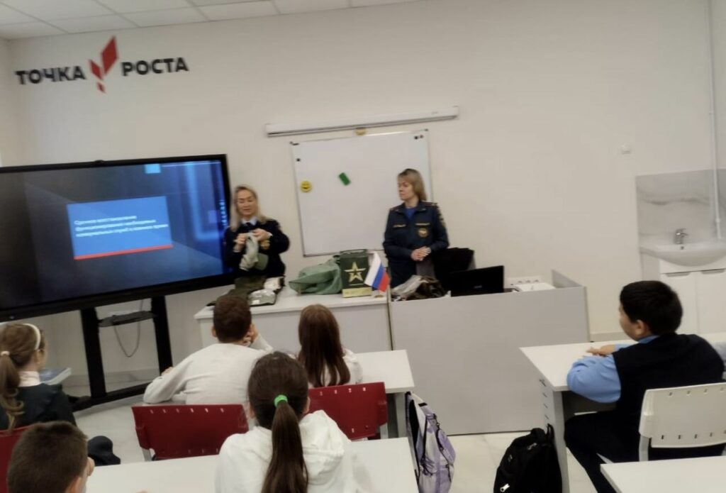 Ученики просмотрели обучающий фильм о гражданской обороне и изучили содержимое тревожного чемоданчика, узнали о важности внимания к сообщениям в СМИ при чрезвычайных обстоятельствах.