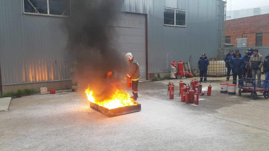 Прежде чем начать практическое занятие Председатель совета Ломоносовского местного отделения ВДПО ЛО Мангасарян Сейран Георгиевич провел теоретическую часть, объяснив новеньким сотрудникам, и напомнив старым, как правильно использовать первичные средства пожаротушения – огнетушители.